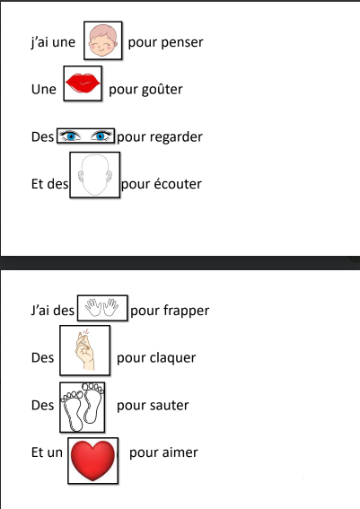 - Le schéma corporel : Une comptine du corps pour identifier et nommer les parties du visage et des membres (tête, bouche, yeux, mains, pieds...).